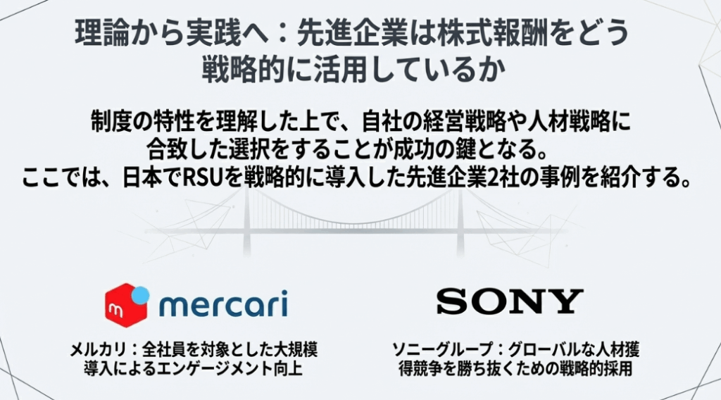 将来の株式報酬を約束する形で付与されるため、「将来の利益のために会社に留まろう」という強力なリテンション効果を発揮します。ソニーグループの事例のように、グローバルな人材獲得競争において、競合他社に見劣りしない魅力的な報酬パッケージを提示する上で不可欠なツールとなり得ます。