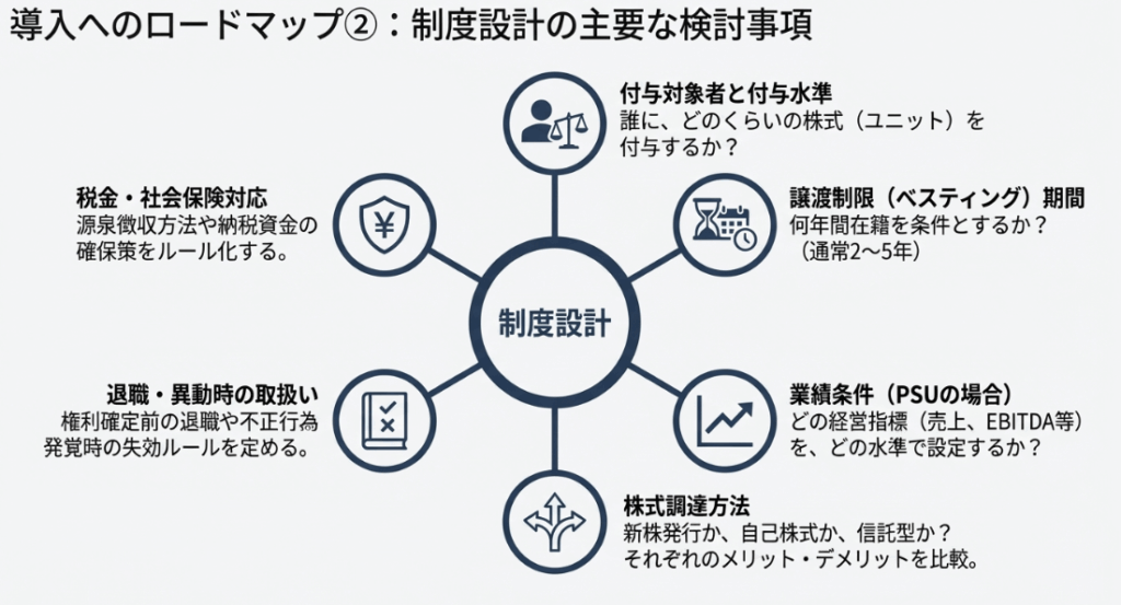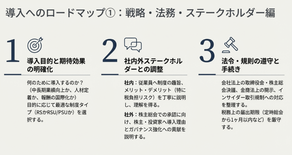 第一歩として「何のために制度を導入するのか」という目的と期待効果を明確化することです。中長期的な業績向上、優秀な人材の定着、報酬水準の国際化など、目的によって最適な制度(RSかRSU/PSUか)が異なるため、この点が制度設計の出発点となります。