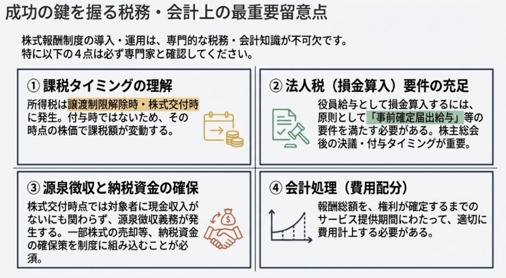 所得税は、譲渡制限が解除された時点の株価を基に計算されます。付与時よりも株価が大幅に上昇している場合、対象者の税負担が想定以上に膨らむ可能性があります。