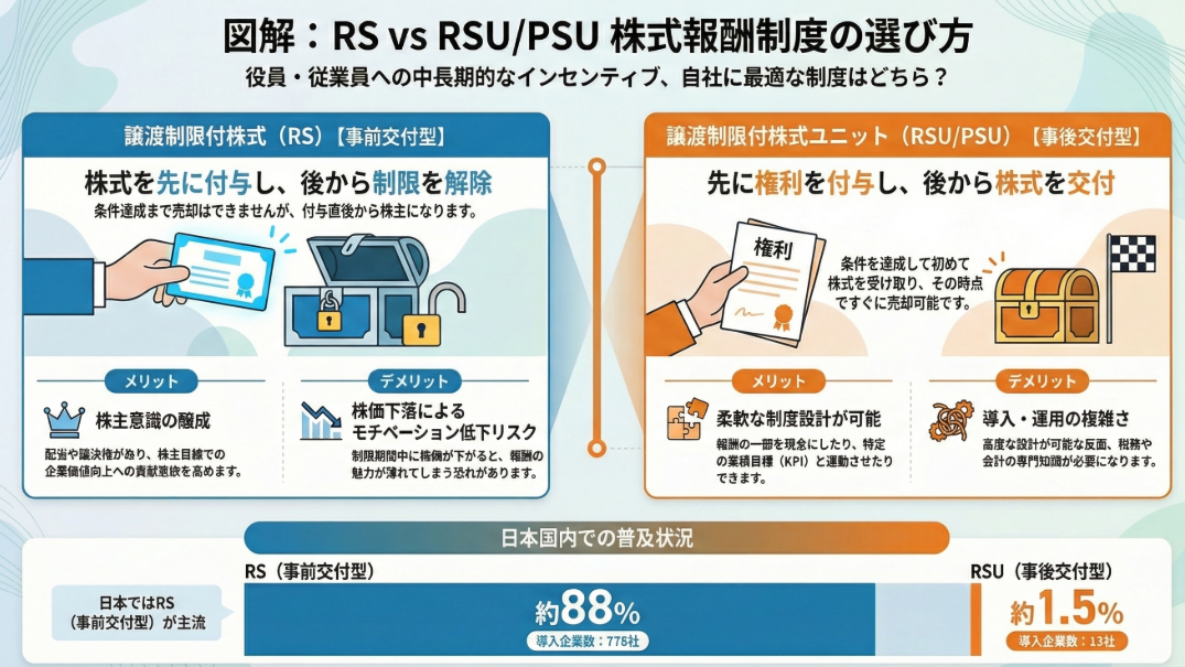 上場企業における中長期インセンティブ報酬制度である譲渡制限付株式 (RS)と譲渡制限付株式ユニット (RSU/PSU)の仕組み、相違点、導入のポイントを解説します。