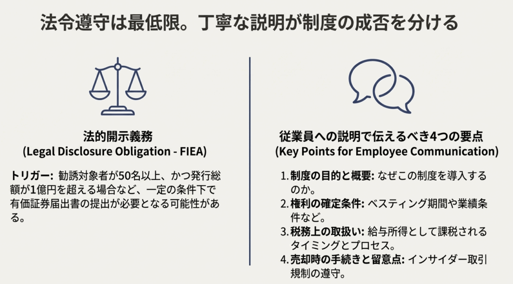 制度のメリットだけでなく、税金や株価変動リスクといった注意点も含めて丁寧に説明することが、従業員の理解を深め、将来のトラブルを未然に防ぐ鍵となります。