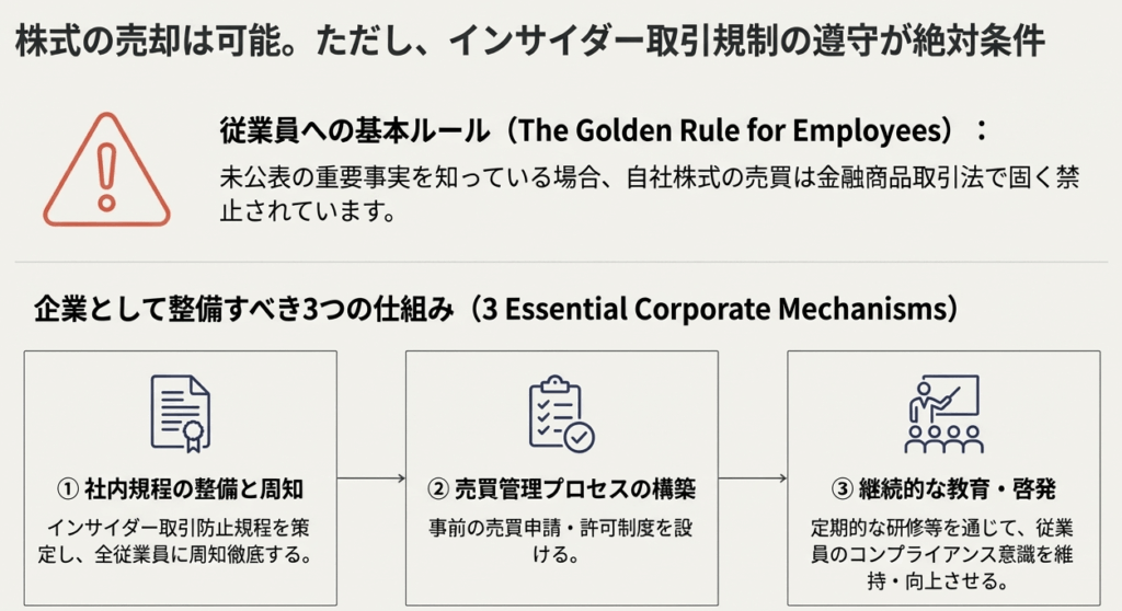 そのため、売却を希望する従業員は、自身が未公表の重要事実を保有していないか確認した上で、会社が定めるインサイダー取引防止のための社内ルールや手続(例:事前に所定部署への届出や許諾)を遵守することが望まれます。