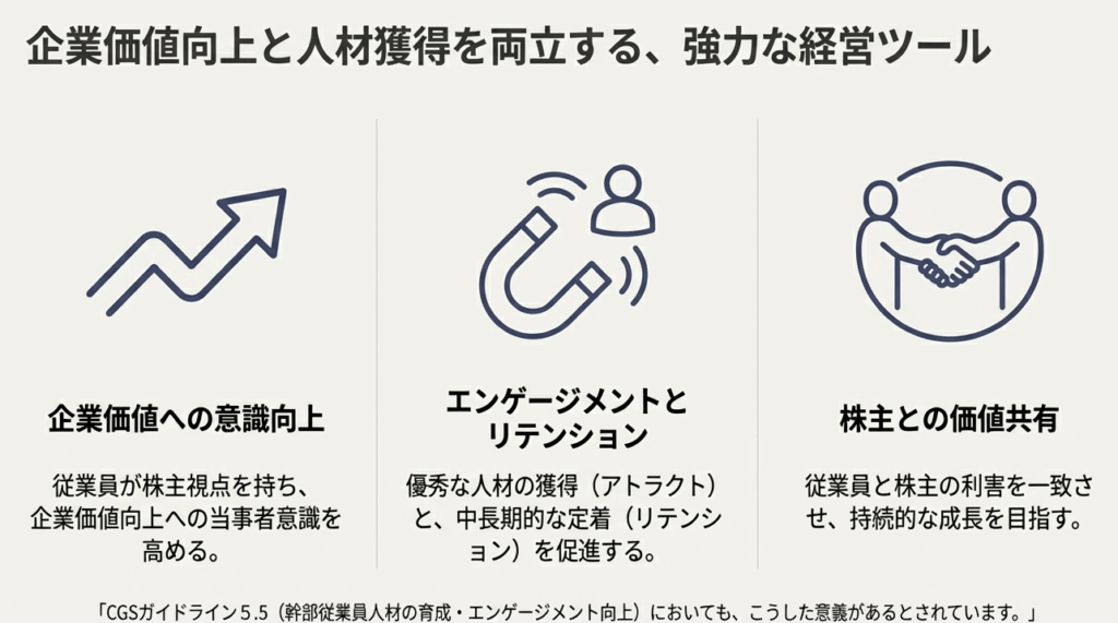 主な意図は、従業員の企業価値や株価に対する意識を高め、エンゲージメントを向上させることです。これにより、優秀な人材の確保や定着(リテンション)を図ることも目的とされています。