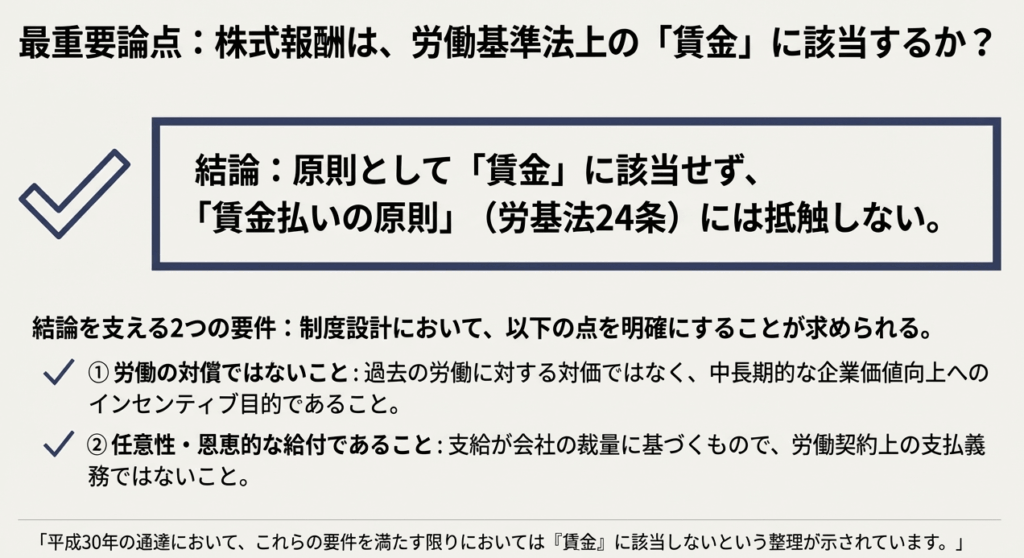 株式報酬が労基法第11条の「賃金」に該当する場合であっても、通貨による賃金等と合算した額を基準として、労働の対価全体の中で、労働者が受ける利益の主たるものであることなど、特定の要件を満たす場合には、通貨払いの原則に抵触しないと整理されています。