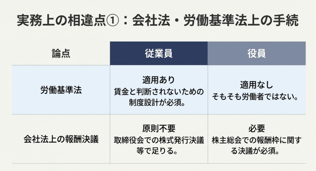 従業員向けと役員向けでは、制度の法的・税務的位置づけが大きく異なります。最も重要な違いは、従業員には適用される「労働基準法の適用の有無」と、会社側の「法人税法上の損金算入ルールの違い」です。また、株式を発行するための会社法上の手続きにおいても、役員の場合は株主総会での報酬決議が必要ですが、従業員の場合は取締役会決議等、より簡便な手続きで対応できる場合があります。