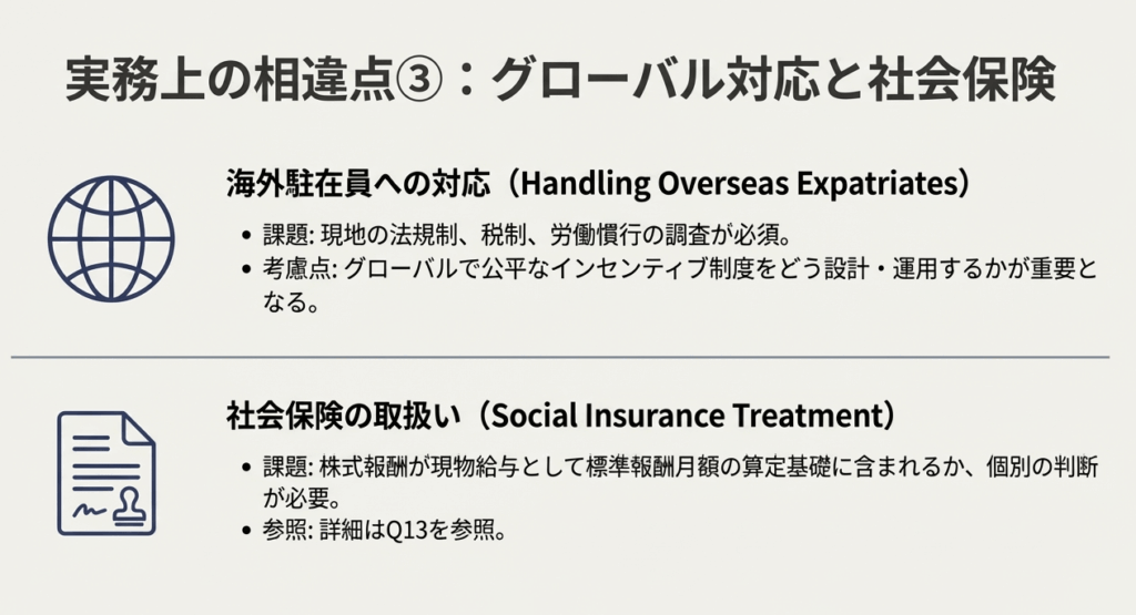 問10: 企業が多くの従業員、特に海外子会社の従業員に株式報酬を付与する際に直面する、追加的な複雑さにはどのようなものがありますか?