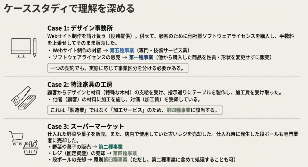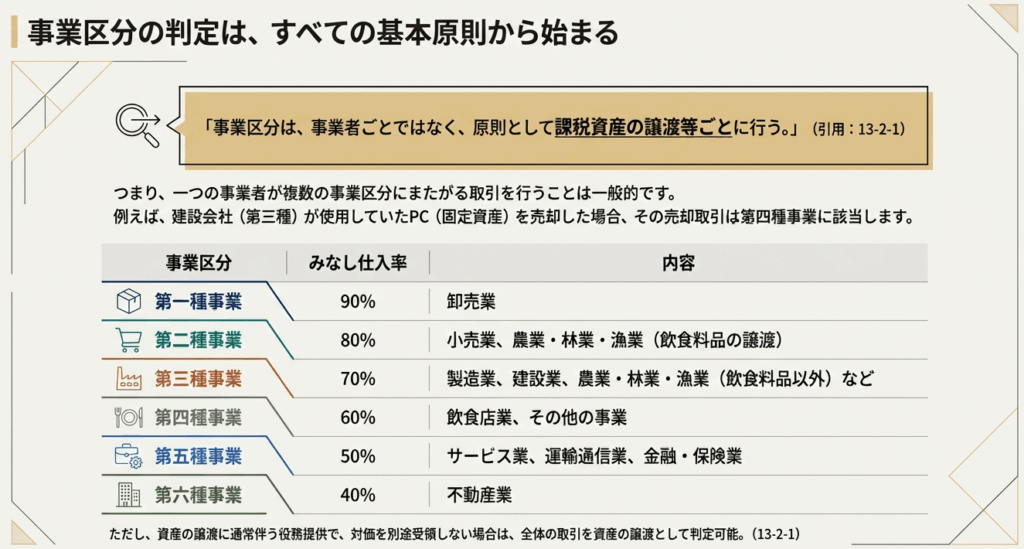 これらの基本原則を踏まえ、次章からは各事業区分の詳細な判定基準と例外規定について掘り下げていきます。