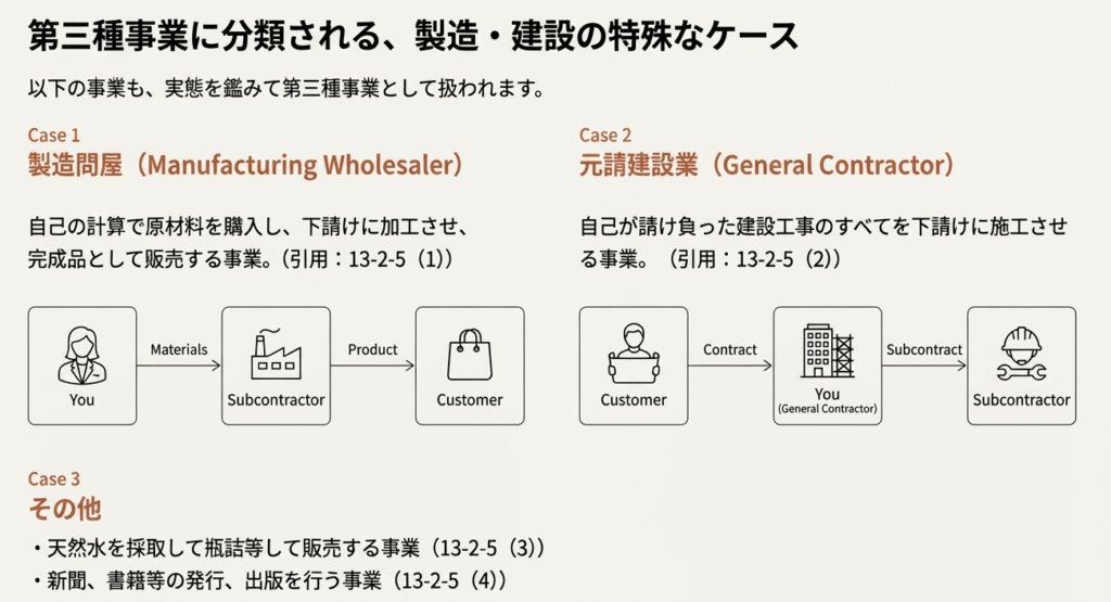 第三種事業は、主に自ら製品を生産したり、建設工事を行ったりする事業を対象とします。この区分の判定は、おおむね日本標準産業分類(JSIC)を基礎としますが、消費税法独自の重要な定義が存在するため注意が必要です。