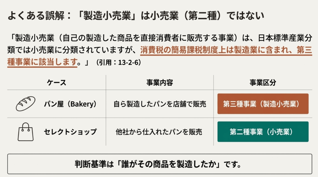 パン屋、ケーキ屋、豆腐屋など、自ら製造した商品を消費者に販売する事業は、小売業ではなく製造業(第三種)として扱います。これは実務上、最も混同しやすい点の一つです(13-2-6)。