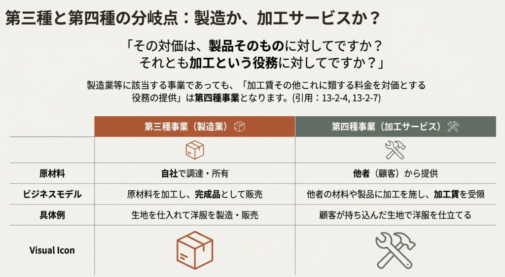他者から支給された原材料や製品に加工を施し、その手数料(加工賃)を受け取るサービスは、たとえ自社が製造業者(第三種)であっても、その取引に限っては第四種事業となります(13-2-7)。自社で材料を仕入れて製品を作るのではなく、あくまで「加工サービス」の提供である点がポイントです。