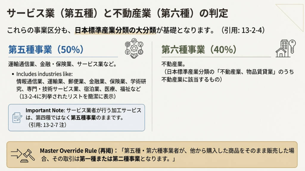 第五種事業(サービス業等)と第六種事業(不動産業)の範囲は、主として日本標準産業分類(JSIC)の大分類に基づいて判定されます。ただし、リストには消費税法上の特定の除外規定が含まれるため、その定義を正確に理解する必要があります(13-2-4)。