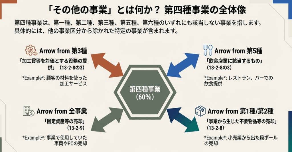 第四種事業は、特定の事業活動を他の主要な事業区分から抜き出して分類したもので、実務上、様々な場面で登場する重要なカテゴリです。