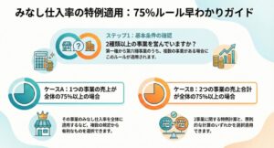 • 事業場ごとの区分 「事業場ごとに一の種類の事業のみを行っている事業者」については、その事業場単位で売上を区分する方法も認められています。例えば、A支店では卸売業(第一種)のみ、B支店では小売業(第二種)のみを行っている場合、支店ごとの売上を集計すれば、それがそのまま事業区分となります。ただし、一つの支店内でも店頭での小売(第二種)と、そこからの卸売(第一種)が混在している場合は、事業場ごとの区分は適用できず、取引ごとの区分が必要になる点に注意してください。