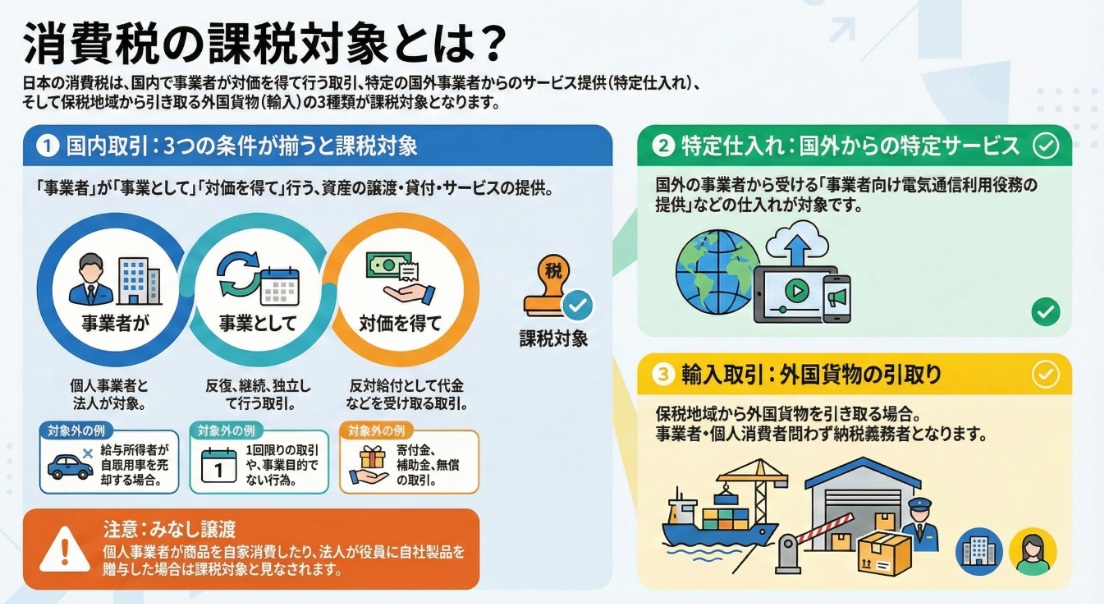 消費税の課税対象は、「国内において事業者が事業として対価を得て行う資産の譲渡等」、「特定仕入れ」、および「保税地域から引き取られる外国貨物の引取り(輸入取引)」の3つです。これらに該当しない国外取引などは課税対象外となります。