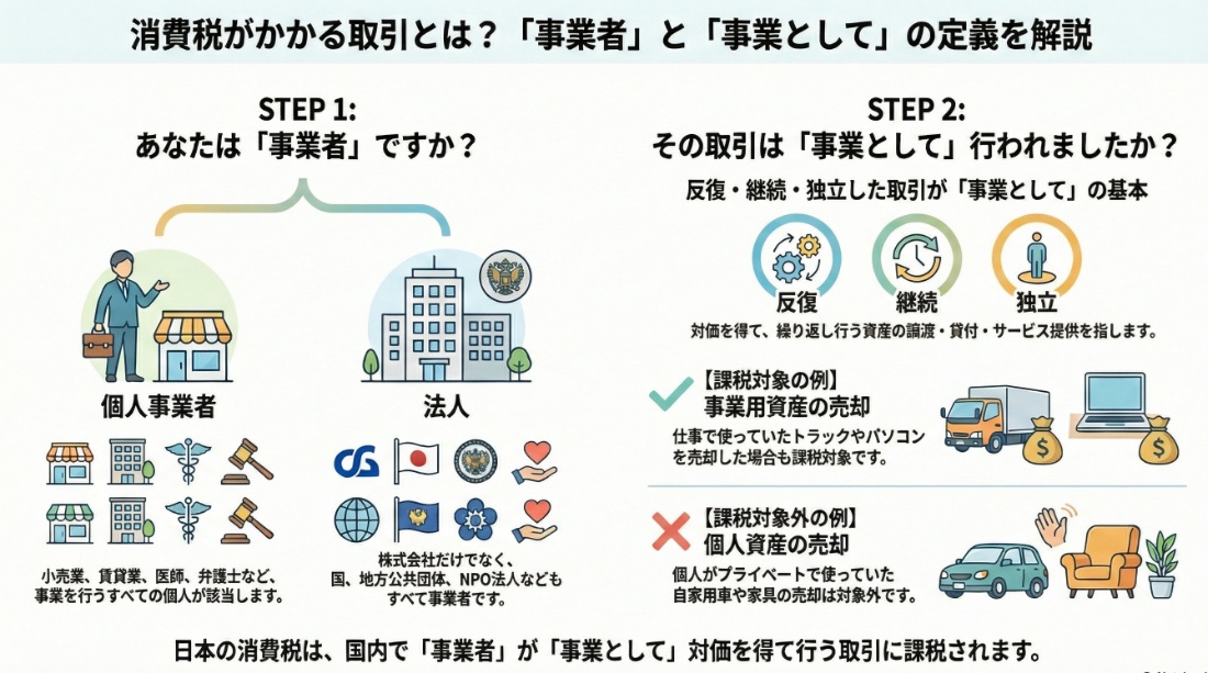 個人事業者は「事業者」の立場と「消費者」の立場を兼ねています。消費税の課税対象となるのは、事業者の立場で行う取引のみです。