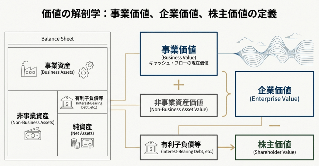 具体的な評価手法を学ぶ前に、私たちが「何を」評価しようとしているのか、その対象となる価値の概念を明確にしておく必要があります。実務では「事業価値」「企業価値」「株主価値」といった言葉が使われますが、これらは似ているようで異なる概念です。