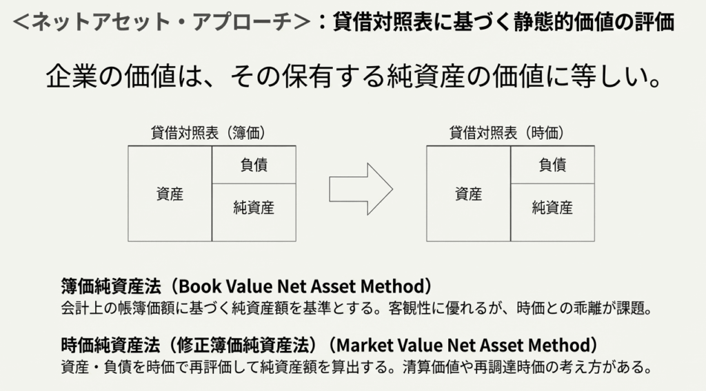 ネットアセット・アプローチは、「主として会社の貸借対照表上の純資産に注目したアプローチ」です。企業の清算価値や、資産の客観的な価値を評価するのに適しています。