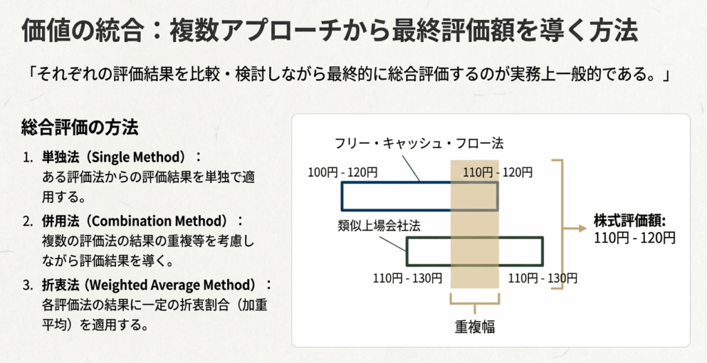 複数の評価法によって算出された価値レンジを比較し、それらが重複する範囲を目安として最終的な評価額を導き出す方法です。例えば、FCF法で100円~120円、類似上場会社法で110円~130円と評価された場合、重複する110円~120円を最終的な評価レンジとします。