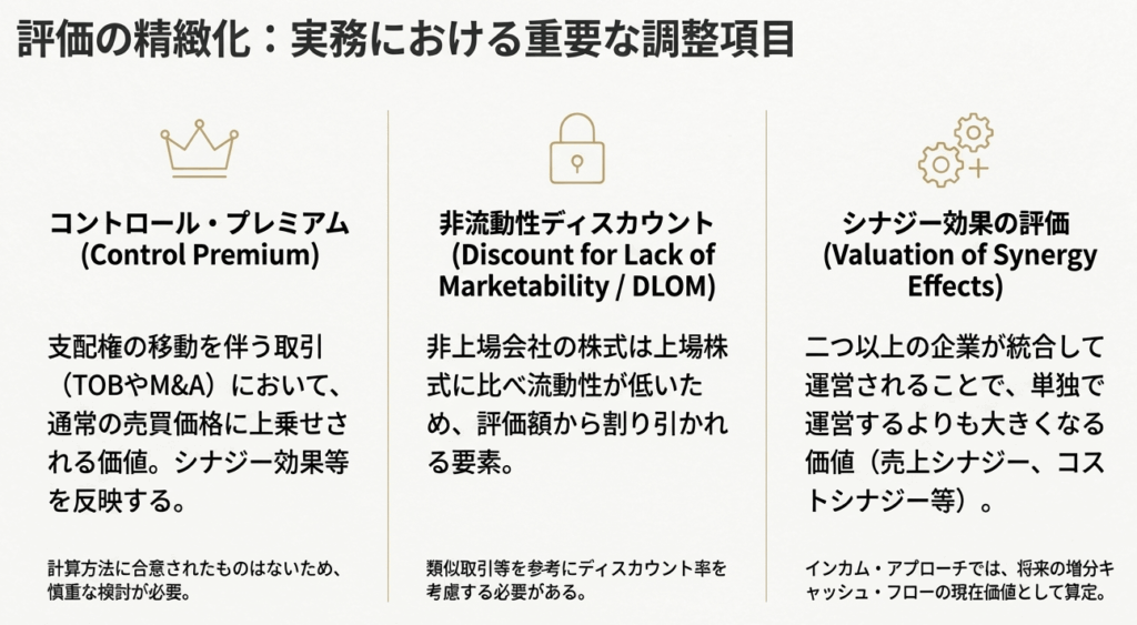 M&Aなどで企業の支配権(コントロール)を取得する場合、少数株主としての価値に加えて、経営をコントロールできることの価値(コントロール・プレミアム)が上乗せされることがあります。逆に、非上場会社の株式は上場株式と比べて簡単に売却できず流動性が低いため、その価値を割り引いて評価する(非流動性ディスカウント)必要があります。これらの調整を適切に行えるかが、評価の精度を左右します。