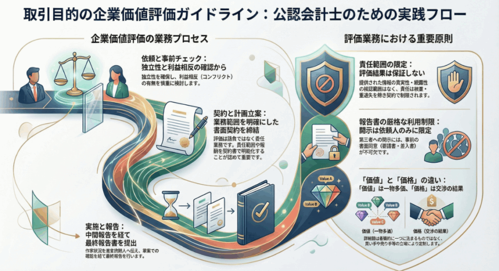 企業価値評価の実務を具体的に理解するために、ここでは業務の全体像から、評価額の拠り所となる主要な概念、そして我々専門家が遵守すべき倫理規定まで、順を追って解説していく。