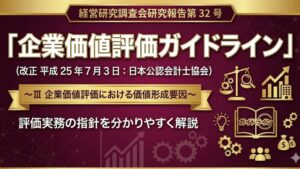 日本公認会計士協から平成 19 年5月 16 日(改正 平成 25 年7月3日)に公表された経営研究調査会研究報告第 32 号「企業価値評価ガイドライン」のうち「Ⅶ 今後の企業価値評価業務と検討課題」について解説します。