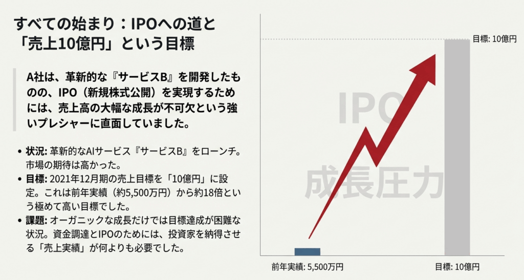 不正の根源には、経営トップが抱いていた売上拡大と株式上場への異常なまでの執着がありました。報告書によれば、経営トップは社内に対し**「2021年の売上目標10億円」**という具体的な、しかし当時の実績からすれば極めて高い目標を掲げていました。