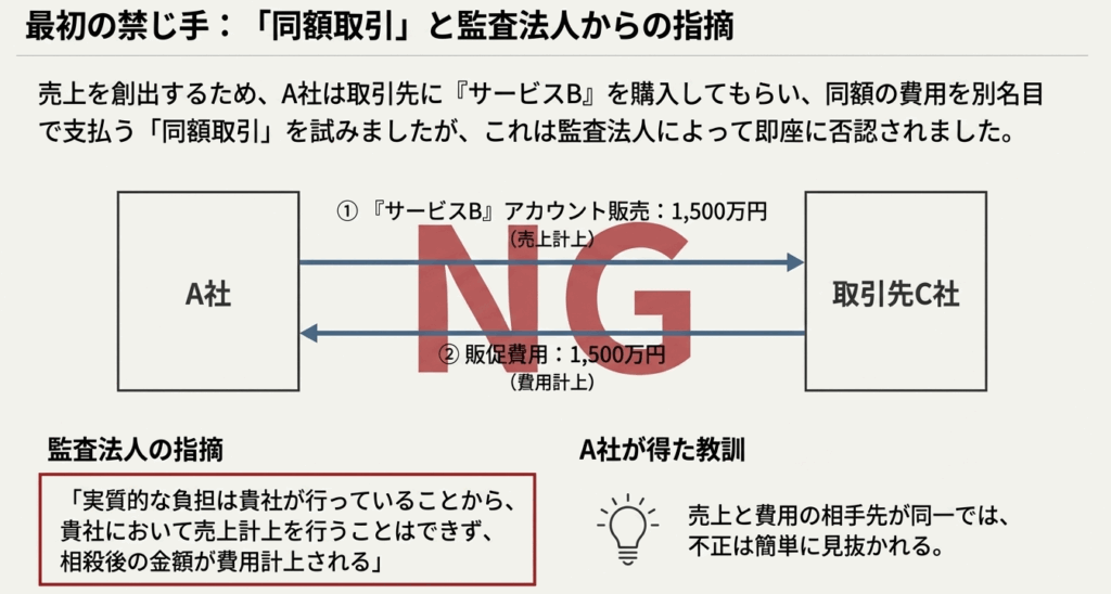 まずA社は、J社のような取引先に対し、サービス購入費と同額の営業支援金等を支払う「同額取引」によって売上を創出しようと試みました。しかし、これは当時のAW監査法人から「実質的な負担はA社が行っており、売上計上はできず、純額で費用計上すべき」と厳しく指摘されました。
