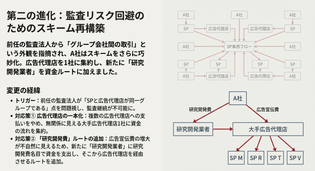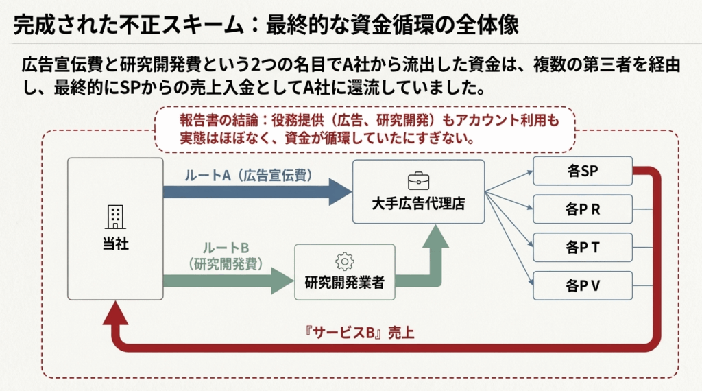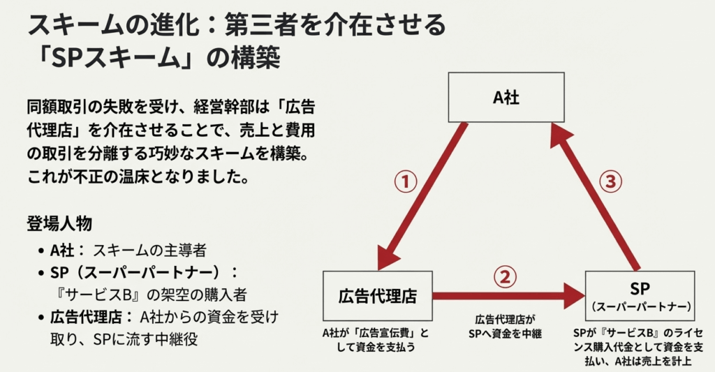 この指摘を回避するため、経営トップは売上先と費用支払先を分離し、第三者を介在させることで取引の外観を偽装する、より悪質な「SPスキーム」を構築するに至ります。A社、SP、広告代理店、研究開発業者がそれぞれ以下の役割を担うことで、取引の外観が巧妙に偽装されたのです。