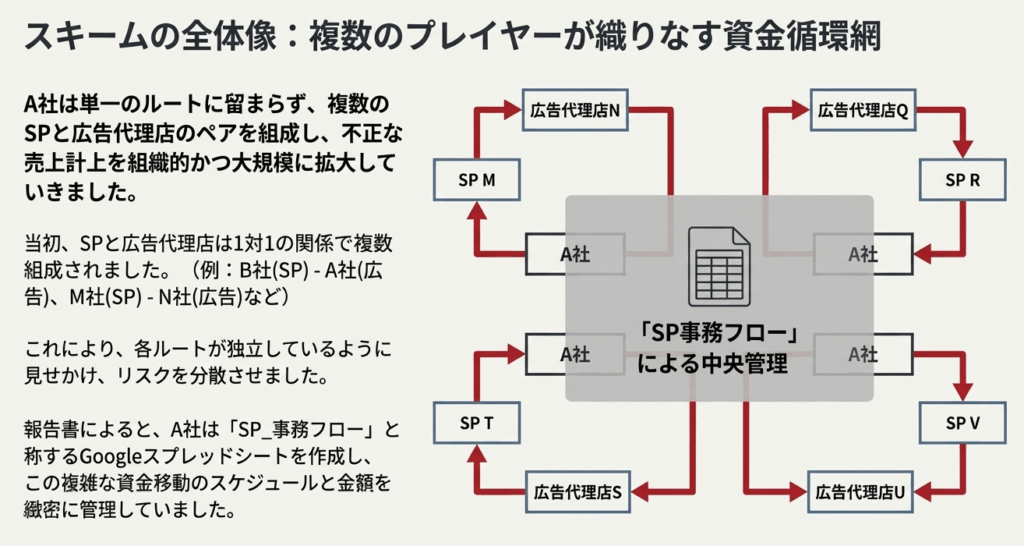 支出した資金が広告代理店などを経由してSPに渡り、最終的にA社への支払いに充てられる一連の流れを、専用のGoogleスプレッドシートで緻密に管理していました。このスプレッドシートは当初「代理店事務フロー」と名付けられていましたが、後に「SP_事務フロー」と改称され、2025年12月までの資金移動計画を含む詳細が記載されていました。この事実は、不正が極めて長期的かつ計画的に企図されていたことを物語っています。