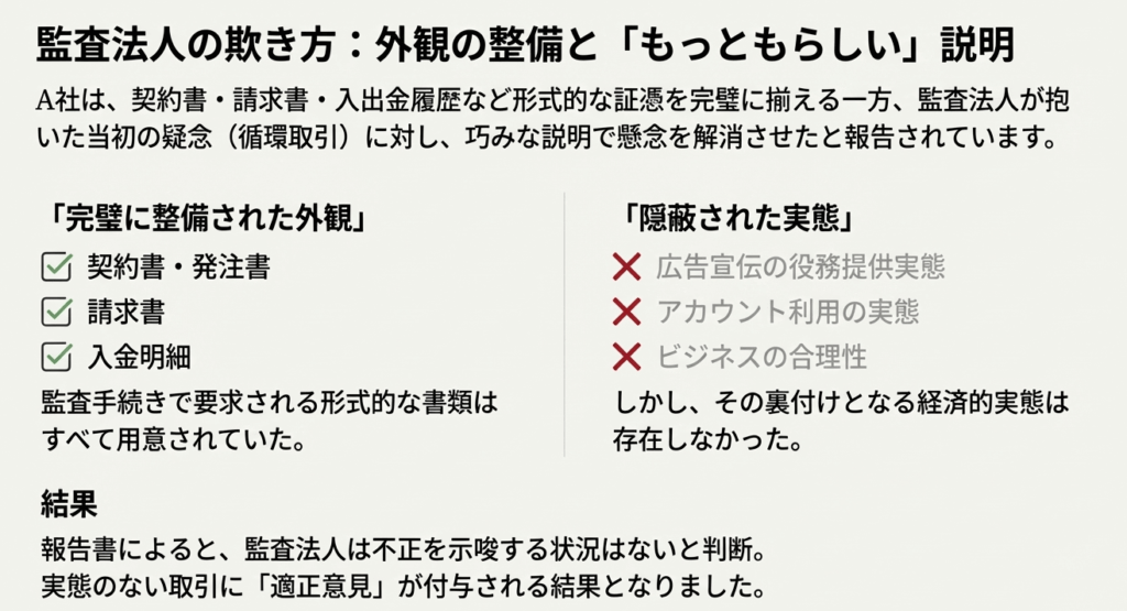 彼らが欺かれた理由は、A社が前の監査法人に指摘された点を解消し、完璧に改ざんされた資料と虚偽の説明で固めた、もっともらしい「偽りの現実」を提示したからです。ゲートキーパーの失敗は、専門家が無能だったからではなく、意図的かつ周到な騙しの手口に直面したからに他なりません。