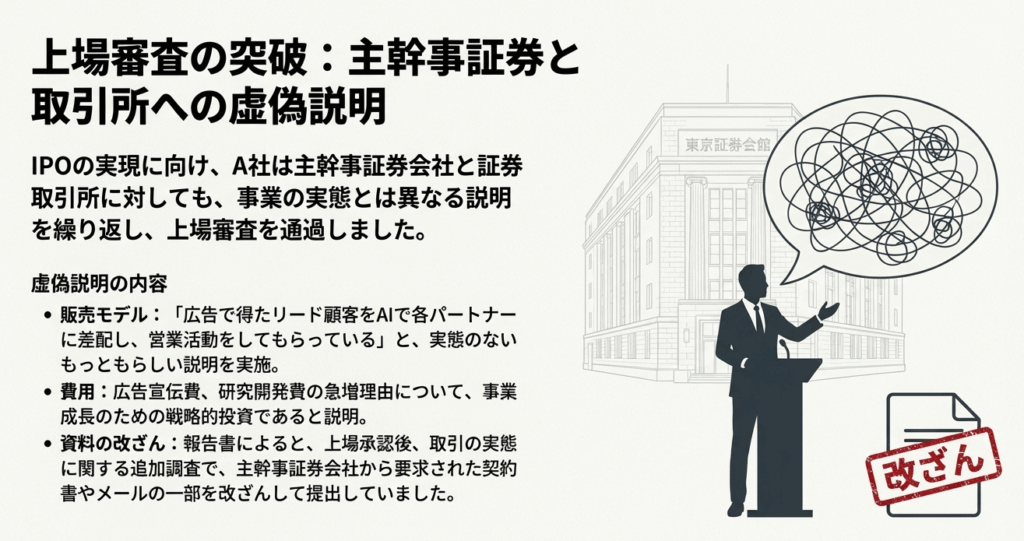 株式上場の審査過程において、売上急拡大の理由、高額な広告宣伝費の具体的な使途、エンドユーザーの実在性など、審査の根幹に関わる重要事項について、実態とは全く異なる虚偽の説明を行いました。 特に悪質だったのは、上場承認後にバーター取引の疑義を指摘された際の対応です。