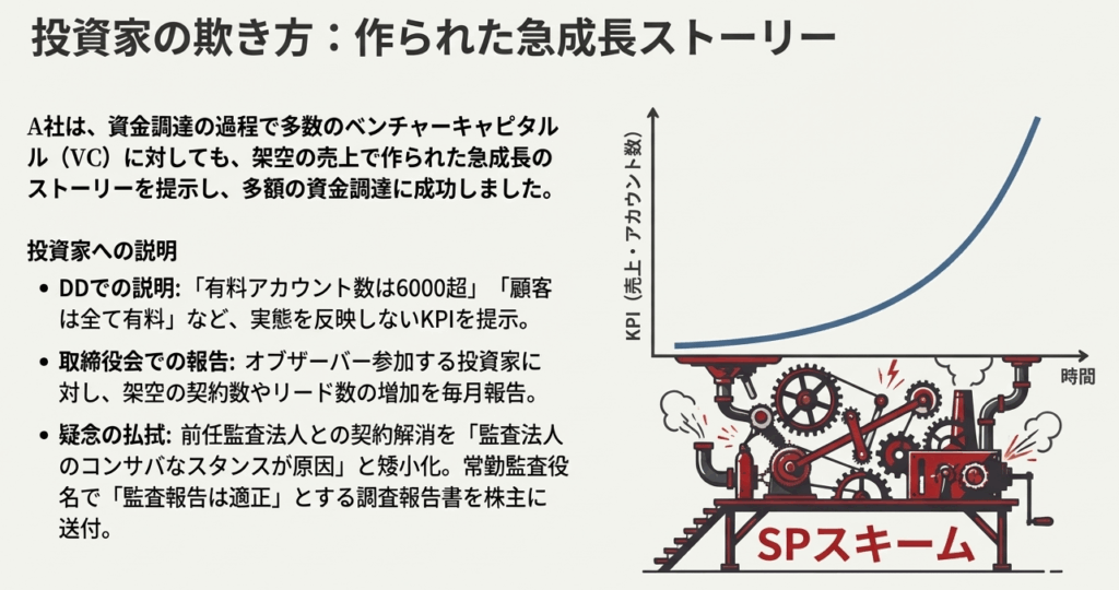 SPに対してサービスBのライセンスを発行するという名目で、実態のない売上を計上しました。これにより、急成長するSaaS企業という外観を作り出しました。