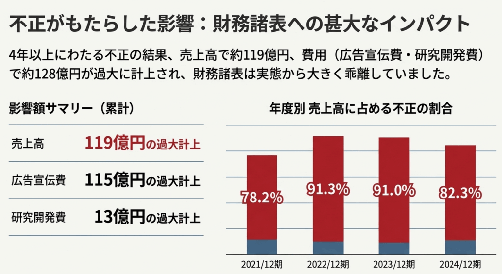この結果、2020年12月期から2024年12月期までの累計で、売上高が約119億円、広告宣伝費が約115億円、研究開発費が約13億円過大に計上されていたとの指摘を受けています。