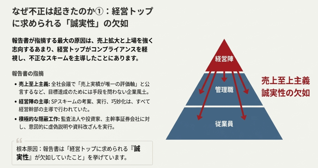 本件の根本原因が「経営トップの誠実性の欠如」にあったことは明白です。経営陣から売上や利益に対して過度なプレッシャーがかけられる環境では、現場が不正に手を染めるリスクは格段に高まります。
