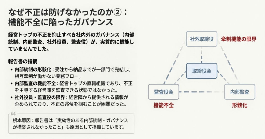 なぜ、これほど大規模な不正が長期間にわたって防げなかったのでしょうか。その答えは、内部統制とガバナンスが完全に崩壊していたことにあります。