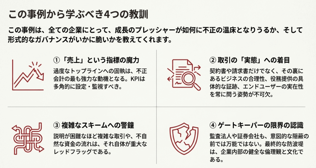 この事例は、単なる過去の不祥事として片付けてはなりません。なぜなら、そこには巧妙に仕組まれた循環取引の実態、決定的に欠如していた内部統制、そして監査法人や主幹事証券会社といった市場のゲートキーパーさえも欺いた悪質な手口が、生々しく記録されているからです。これは、私たち会計実務家にとって、他山の石とすべき実践的な教材に他なりません。