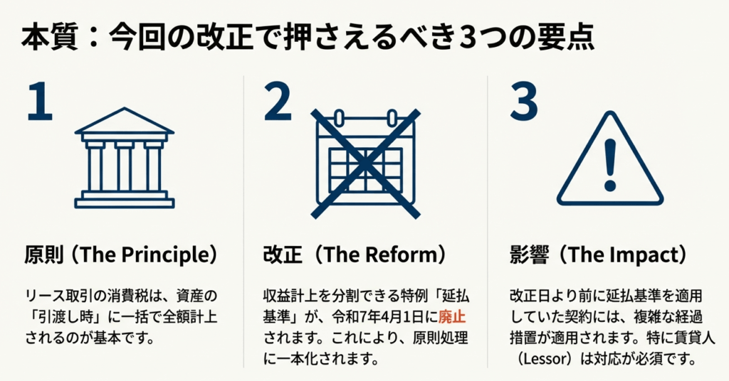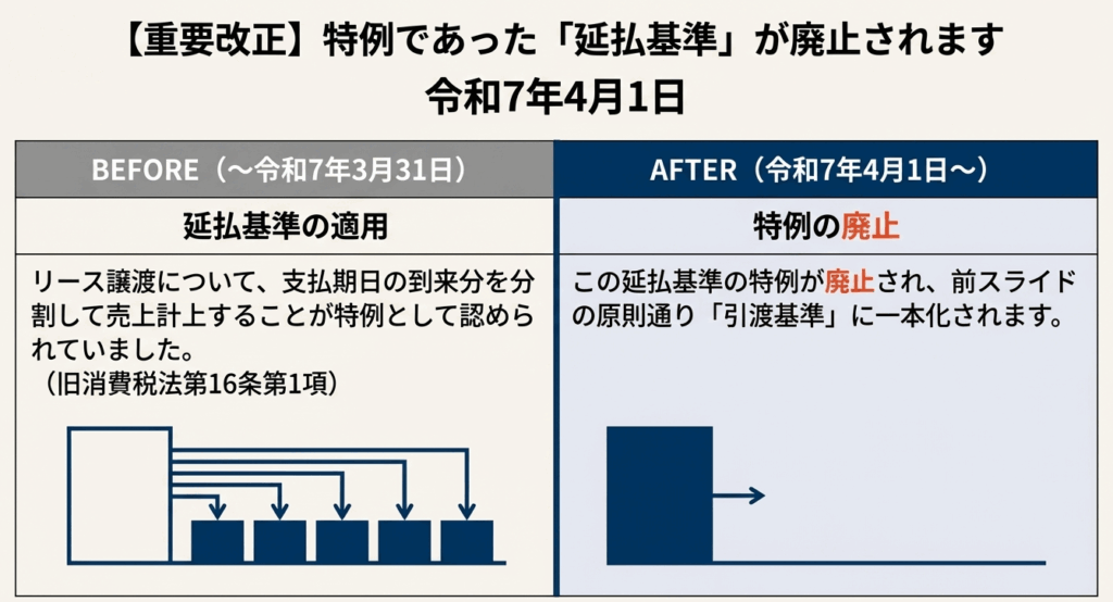 今回の改正で最も重要な変更点は、リース譲渡に係る資産の譲渡等の時期の特例、いわゆる「延払基準」が令和7年4月1日から廃止されたことです。