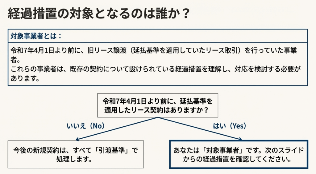 ただし、この変更による実務上の影響を緩和するため、経過措置が設けられています。この措置の対象となるのは「対象事業者」、すなわち「令和7年4月1日前に旧リース譲渡(旧消費税法第16条第1項に規定するリース譲渡)を行っていた事業者等」です。