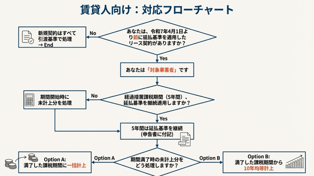 経過措置期間中に延払基準の方法による経理をしなかった場合、その時点で未計上だったリース料残高について、以下のいずれかを選択適用できます。