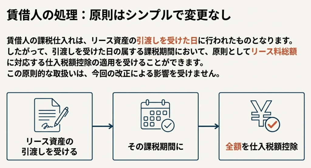 今回の改正は「売買があったものとされるリース取引」が前提です。所有権移転外リース取引を「賃貸借取引」として会計処理している場合は、今回の原則(引渡し時に一括で仕入税額控除)の対象とはならない可能性があるため、別途確認が必要です。