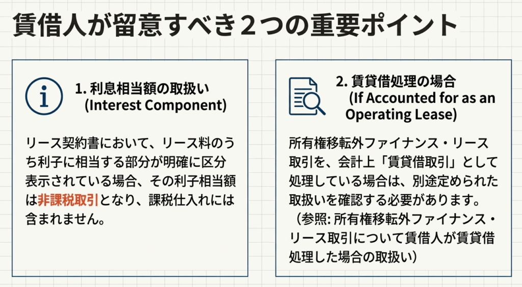 リース契約書の内容を精査し、利息相当額が区分表示されている場合は、その部分を課税仕入れから除外する処理を徹底してください。