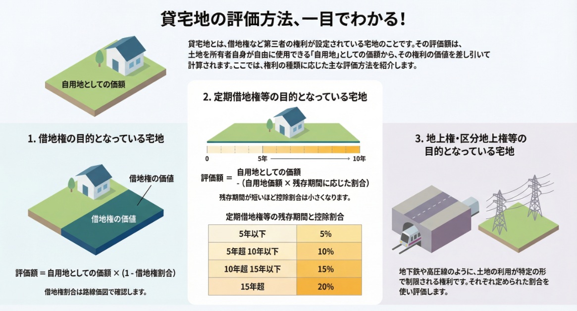 評価は、その宅地の上に存する権利の区分に応じて行われ、主に以下の5種類の方法があります: