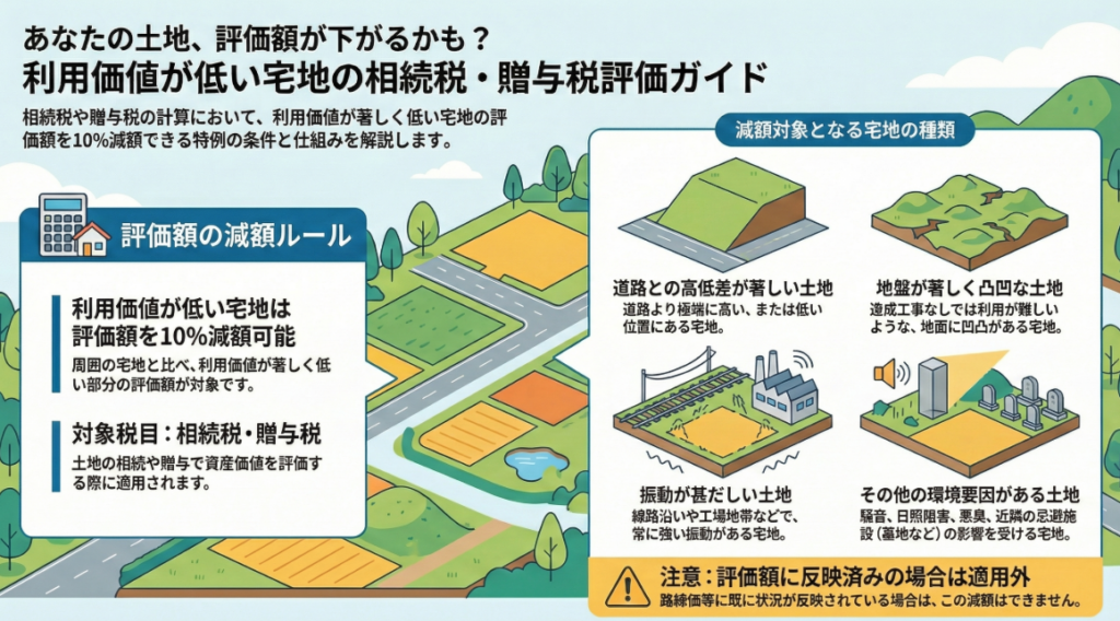 この評価は、道路との高低差、地盤の凹凸、震動、騒音、日照阻害といった要因により、その利用価値が周辺の他の宅地と比較して著しく低下していると認められる宅地に関するものです。これらの宅地の価額を実情に合わせて評価する方法を定めています。