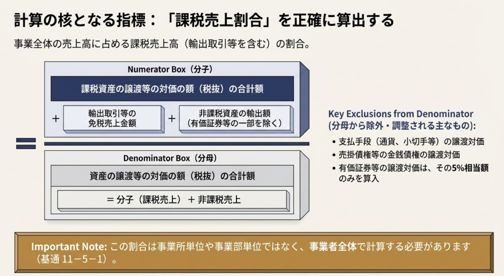 95%ルールの適用可否や、その後の計算方法に大きく関わるのが「課税売上割合」です。次のセクションでは、この割合の具体的な計算方法を掘り下げていきます。