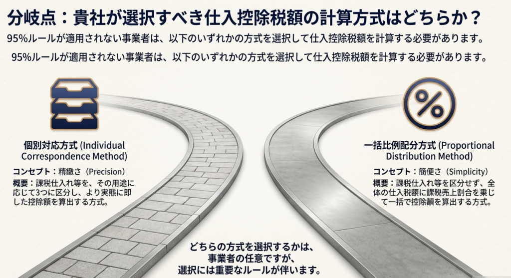 95%ルールが適用されない事業者は、「個別対応方式」と「一括比例配分方式」という2つの計算ルートのいずれかを選択することになります。両者は、計算の精度と事務負担のバランスが異なるため、自社の状況に合わせて慎重に選択する必要があります。これは「計算の精度と事務負担のトレードオフ」の関係にあると言えるでしょう。
