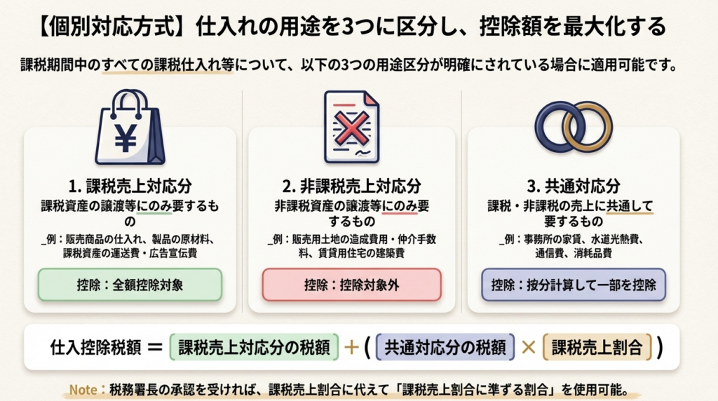 個別対応方式は、その名の通り、課税仕入れ等をその用途に応じて個別に区分し、より実態に即した控除税額を算出する、厳密な計算方法です。計算は、まず全ての課税仕入れを以下の3つに区分することから始まります。