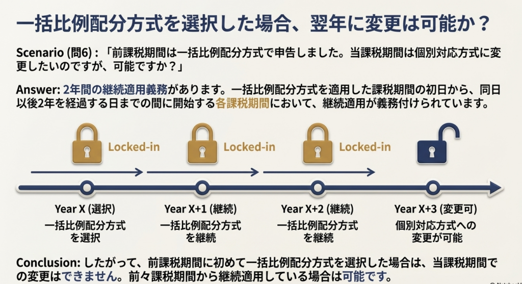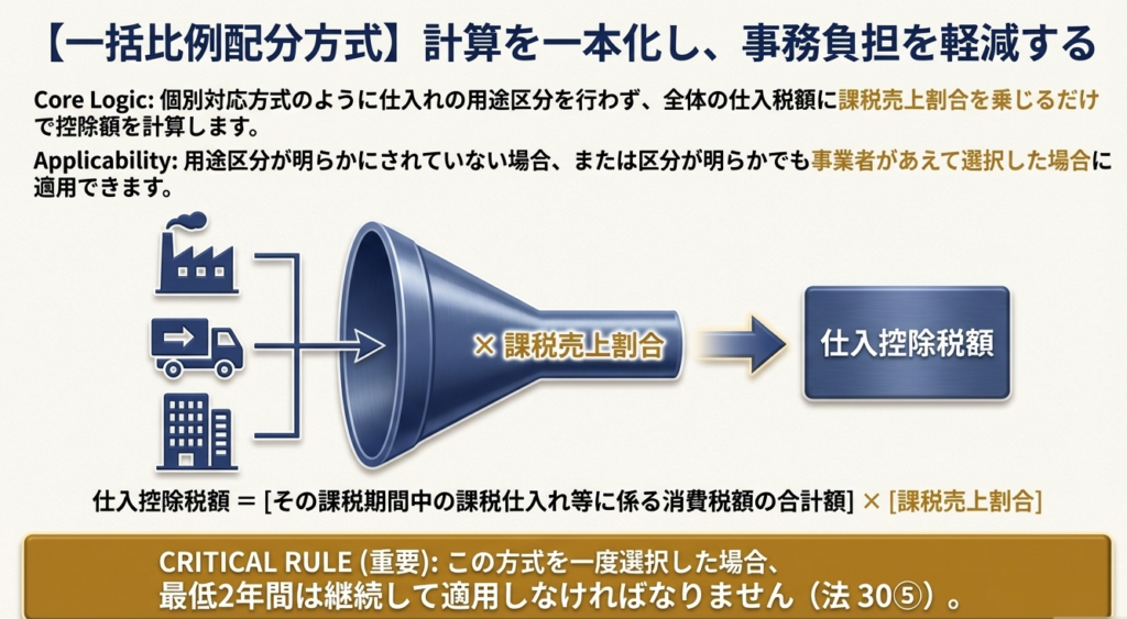一括比例配分方式を一度選択・適用した場合、その課税期間の初日から2年を経過する日までの間に開始する各課税期間において、継続して適用しなければならない。