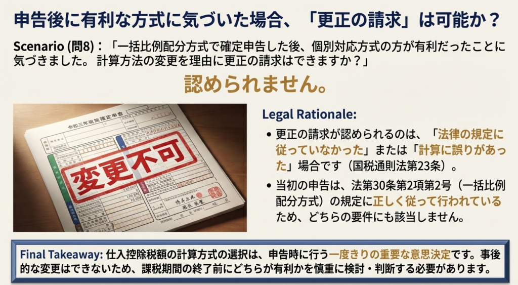 これは、なぜでしょうか。国税通則法に基づく更正の請求は、申告内容が「法律の規定に従っていなかった」または「計算に誤りがあった」場合にのみ認められます。事業者が自ら選択した計算方法は、法に規定された手続きに則っているため、単に有利・不利という理由だけでは、これらのいずれにも該当しないと判断されるのです。計算方法の選択は、申告書を提出する前の、一度きりの真剣勝負であると認識してください。