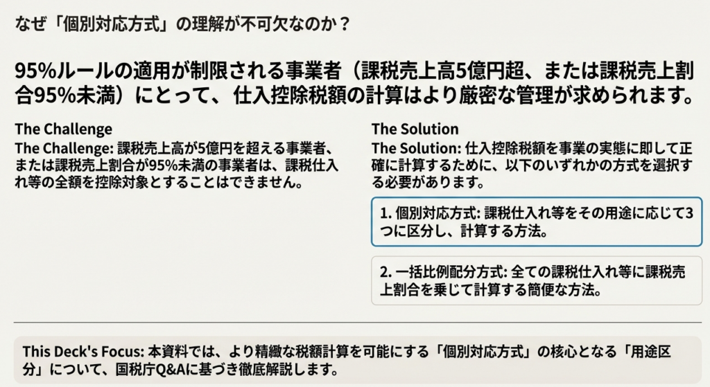 企業の課税売上割合が95%を下回る場合、あるいは課税売上高が5億円を超える事業者様にとって、消費税の仕入税額控除の計算は複雑性を増します。その際に選択する計算方法の一つが「個別対応方式」ですが、この方式を正しく適用できるかどうかは、すべての仕入取引を正確に**「用途区分」**できるかにかかっています。この「用途区分」の精度が、個別対応方式の成否を分けると言っても過言ではありません。