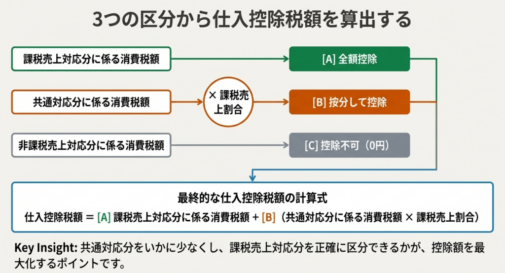 共通対応分とは、課税売上と非課税売上のどちらか一方にのみ要するものとして明確に区分できない課税仕入れを指します。これに分類された仕入税額は、課税売上割合を用いてあん分計算し、控除額を算出します。